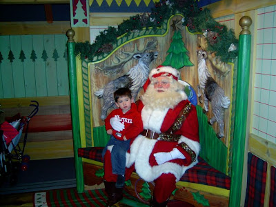 In 2005 we visited Santa at Southpoint Mall in Durham and that year it was like Santa casual day and he was wearing just a holiday shirt w/ suspenders with his red pants. Weird. What was more weird was that Mrs. Claus plopped herself down on the chair with the boys for the picture. Not against the rules or anything, but it was unusual. That was Timmy’s first visit with Santa, he was about 10 1/2 months old. Jacob was 3.