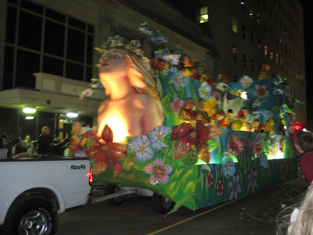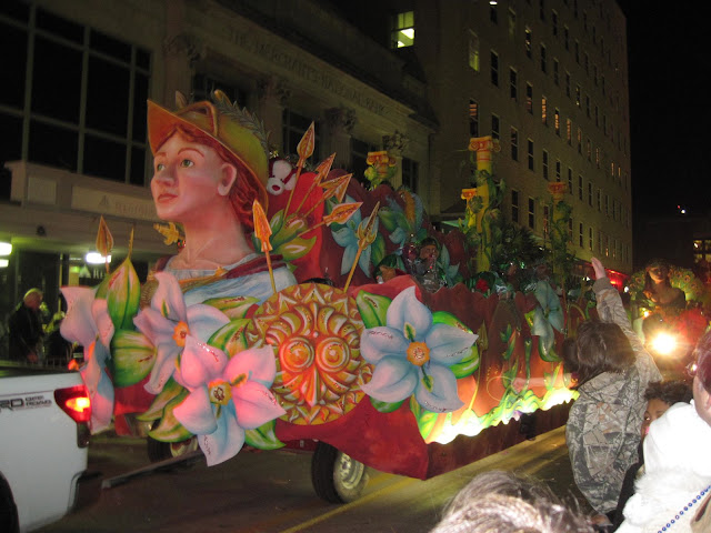 By the time the Mystics of Time parade began, it was after dark. This is apparently one of the most popular krewes in Mobile and their parades are more elaborate. This parade was MUCH more crowded and the families gave way to a younger, more wild crowd. Not quite New Orleans (i.e., everyone kept their clothes on) but the second parade was definitely a different experience.