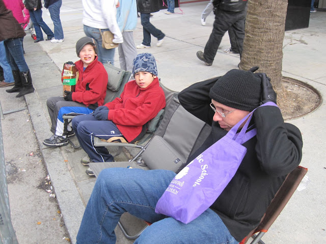 We got primo seating right against the curb. A cold front had passed through and it was COLD sitting in the canyon of high-rise buildings. |