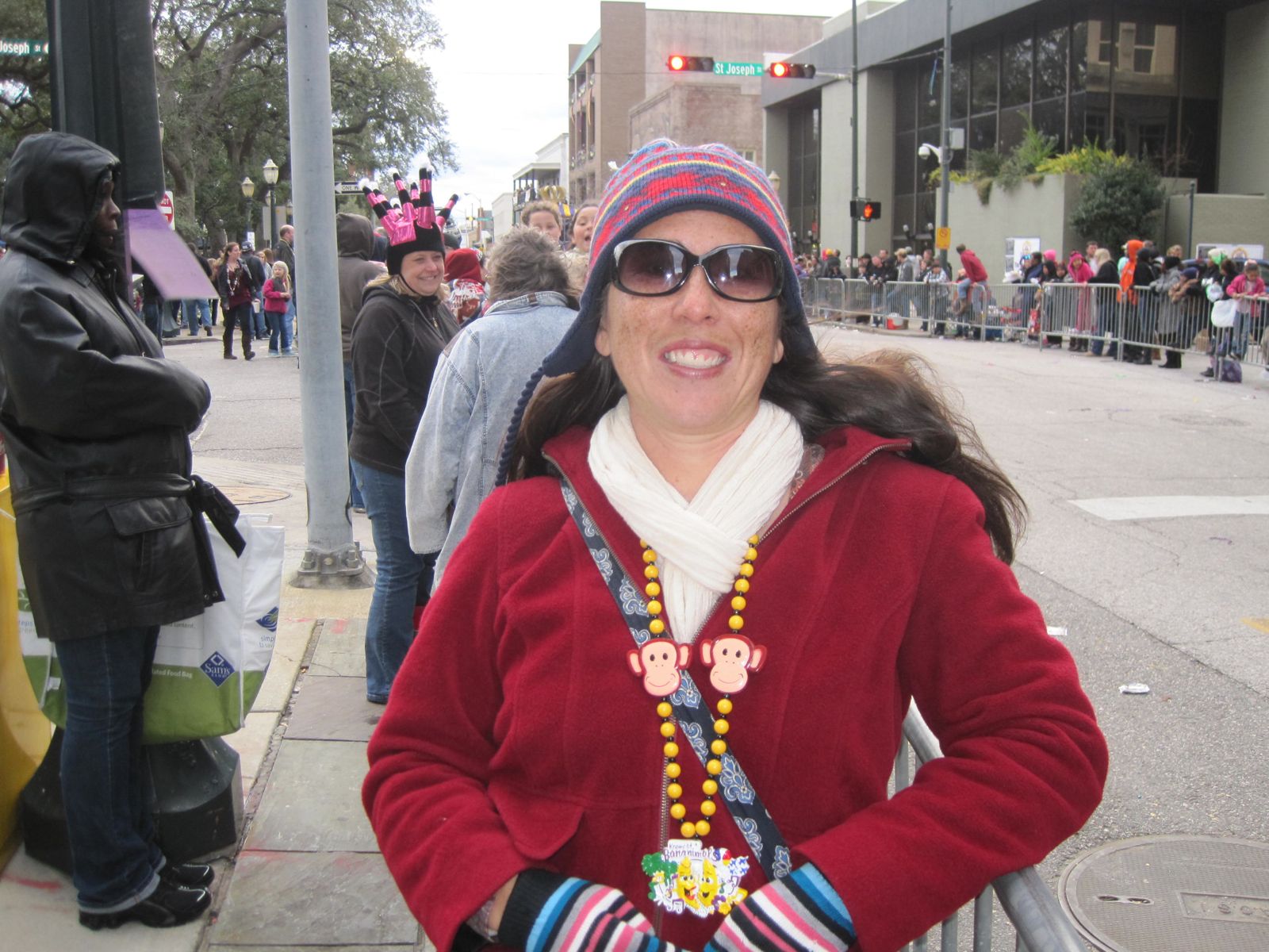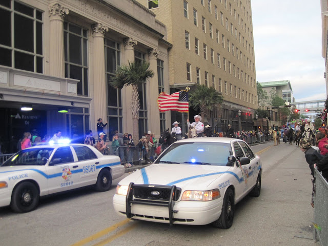 And wing it we did! We got off I-10 in downtown Mobile and were greeted with thousands of people, cars, and cops directing traffic. Folks were paying $15 to park near the start of the parade route, so we wandered around downtown on the periphery of the route and as luck would have it — there was an open parallel parking spot!!! FREE PARKING!!! We grabbed the spot…Dave continued to ask questions as to whether this was a good parking choice, did we need to pay for the parking meter (no, it was free on Sundays), what if we were too far from the parade, etc.