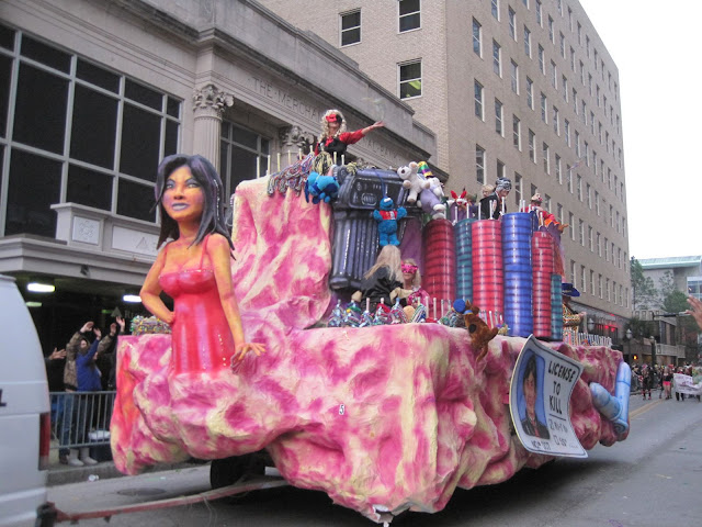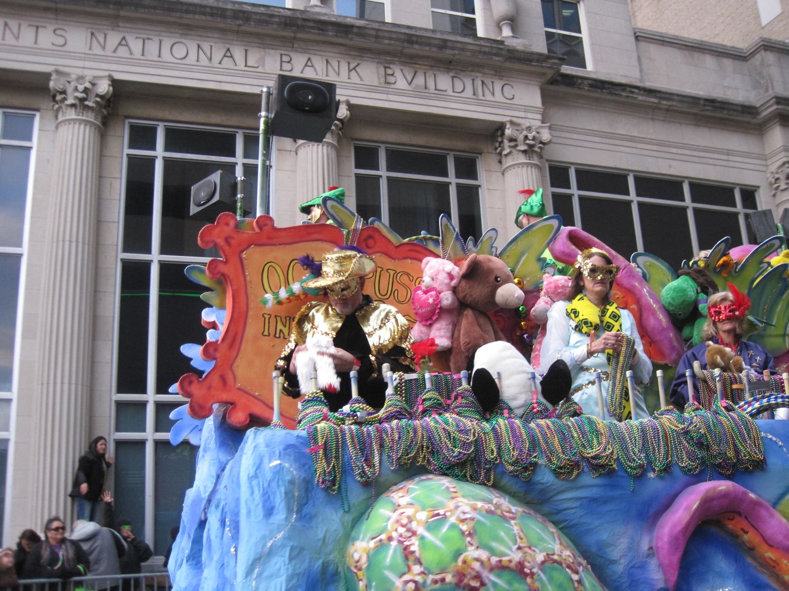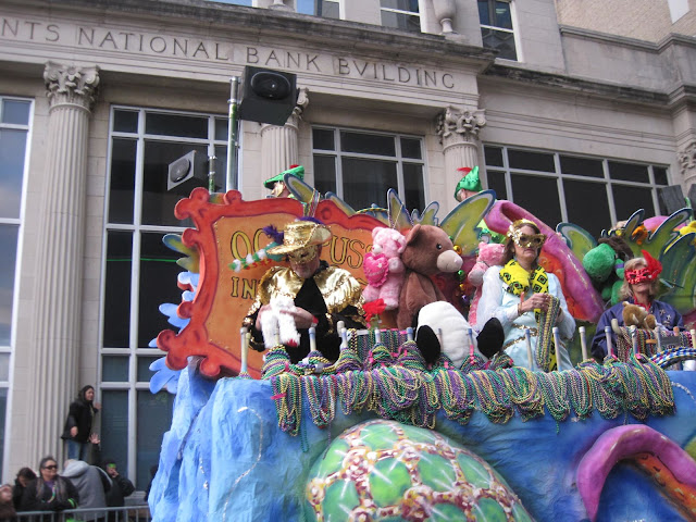 Everyone on the floats were masked. Check out all the beads available to be thrown out! And the stuffed animals behind them! All fair game! |