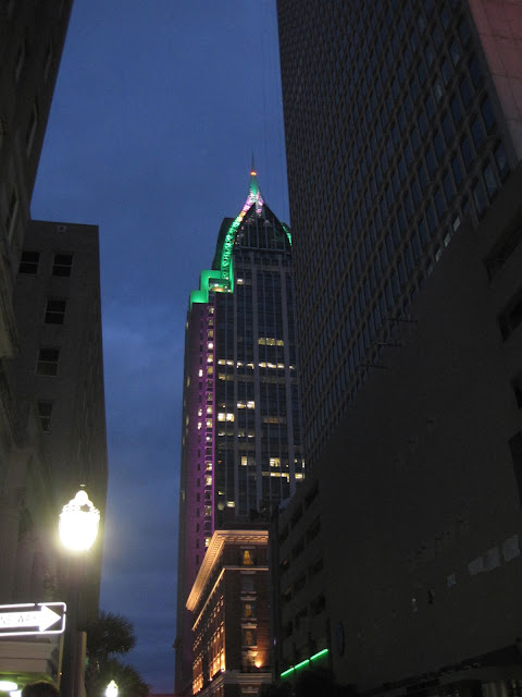This is the RSA Battle House Tower, the tallest building in Mobile (and the tallest building outside of Houston on the Gulf Coast)…all lit up for Mardi Gras! |