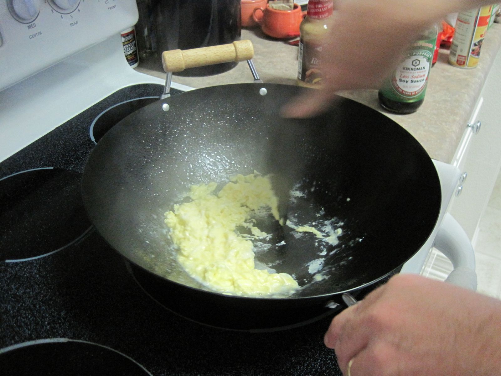 Start by scrambling the eggs. Remove the eggs to a dish when they’re finished. They’ll be added in at the end:
